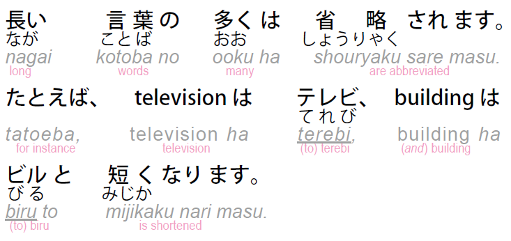 Many long words are abbreviated. For instance, television is shortened to terebi, and building to biru.